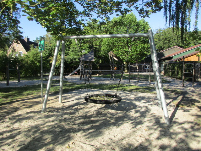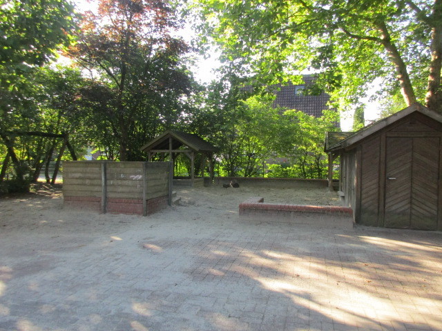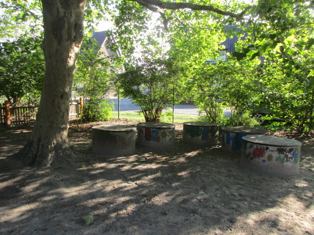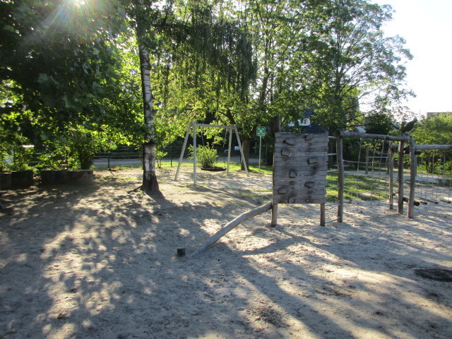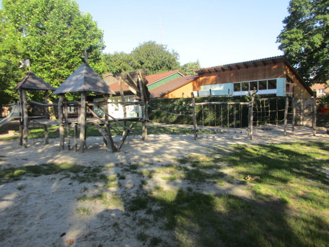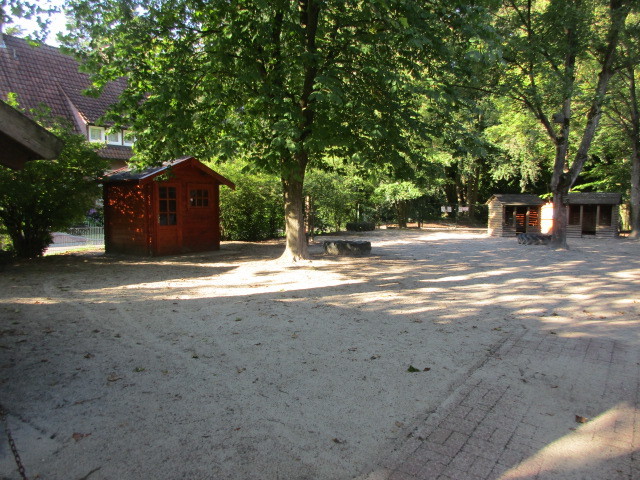 Das Gelände rund um unsere Kita ist weitläufig und mit verschiedenen Spielbereichen ausgestattet. Sehr schön ist der alte und große Baumbestand, der im Sommer viel Schatten spendet und in allen Jahreszeiten für vielfältige Beobachtungen und Spielsituationen Anreize bietet. Die Kinder können hier ihren Bewegungs- und Erkundungsdrang ausleben. Dieses Angebot nutzten wir täglich.